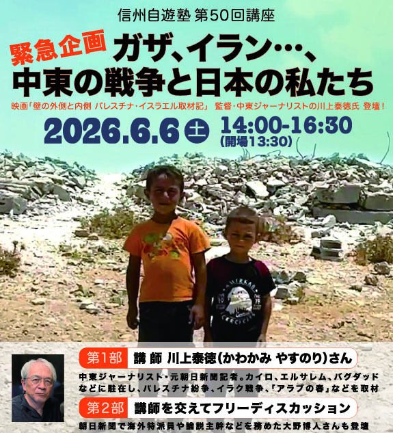 信州自遊塾 > 信州自遊塾NEWS > 講座と活動情報 > 第50回講座「ガザ、イラン…、中東の戦争と日本の私たち」